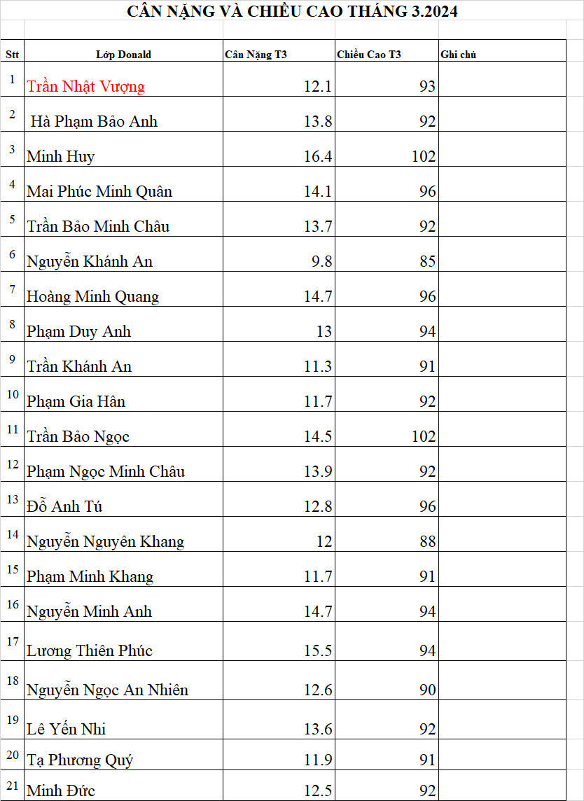 BẢNG THÔNG BÁO CHIỀU CAO CÂN NẶNG THÁNG 3/2024.
