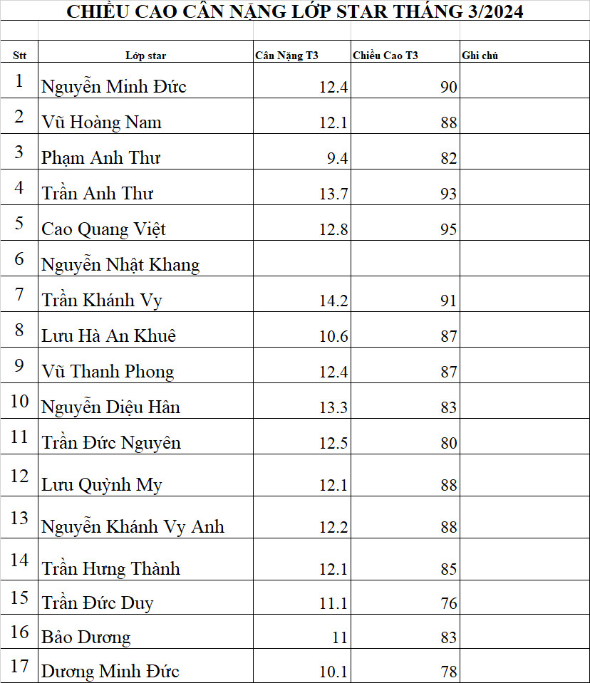 BẢNG THÔNG BÁO CHIỀU CAO CÂN NẶNG THÁNG 3/2024.