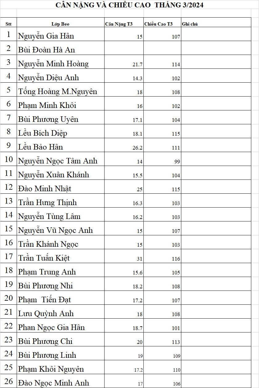 BẢNG THÔNG BÁO CHIỀU CAO CÂN NẶNG THÁNG 3/2024.