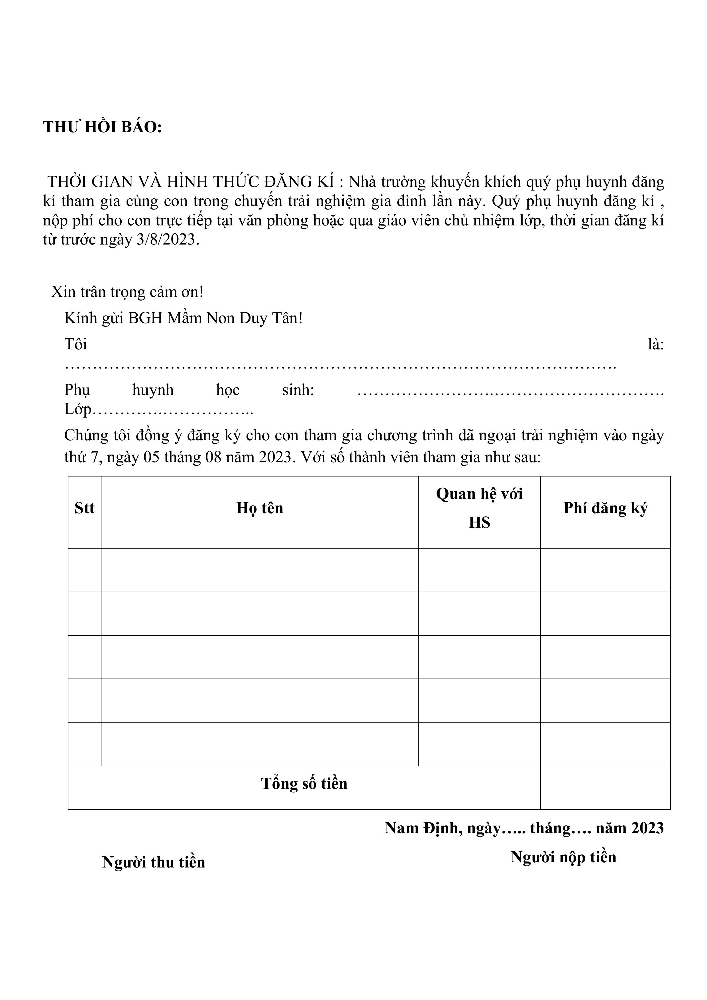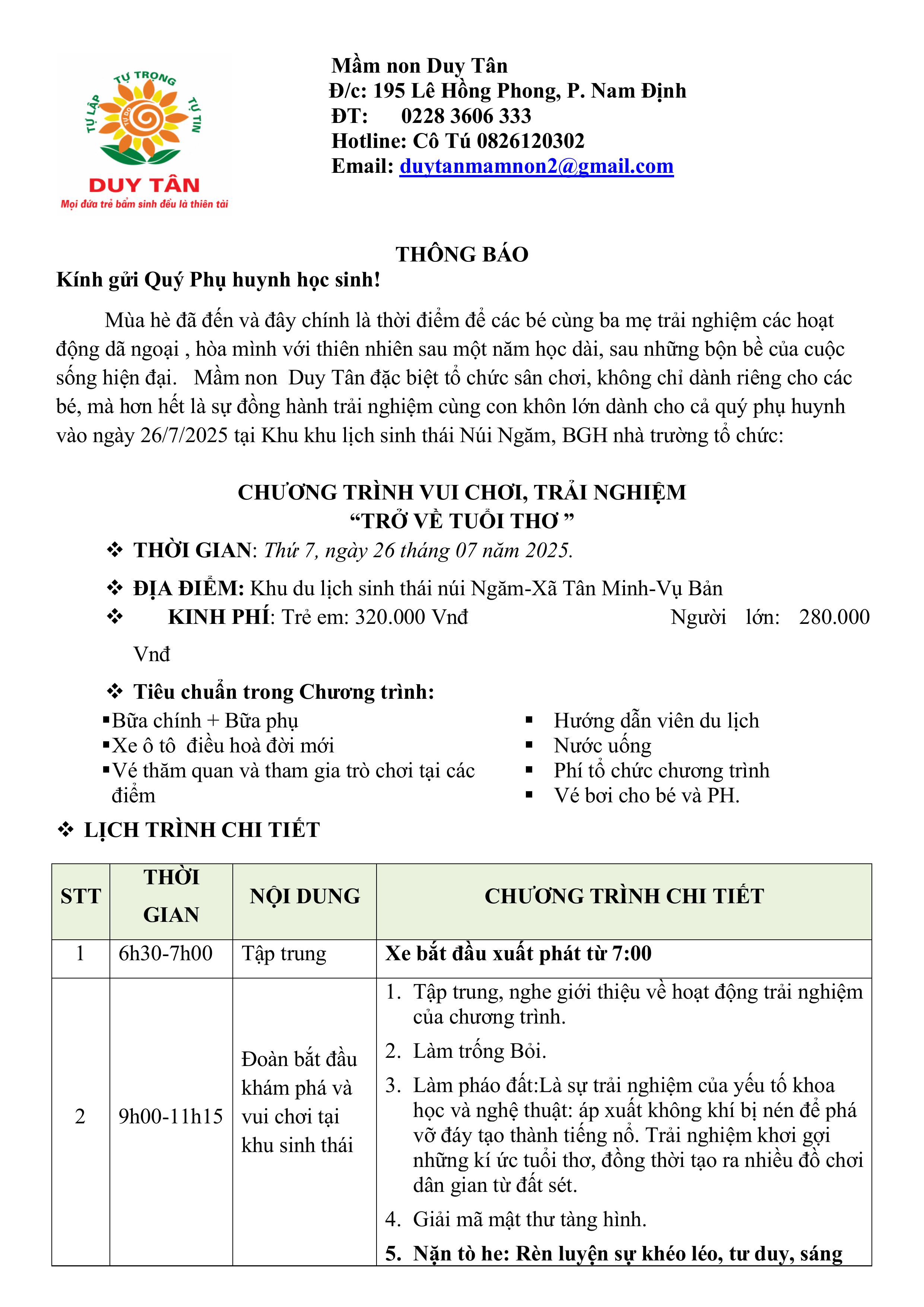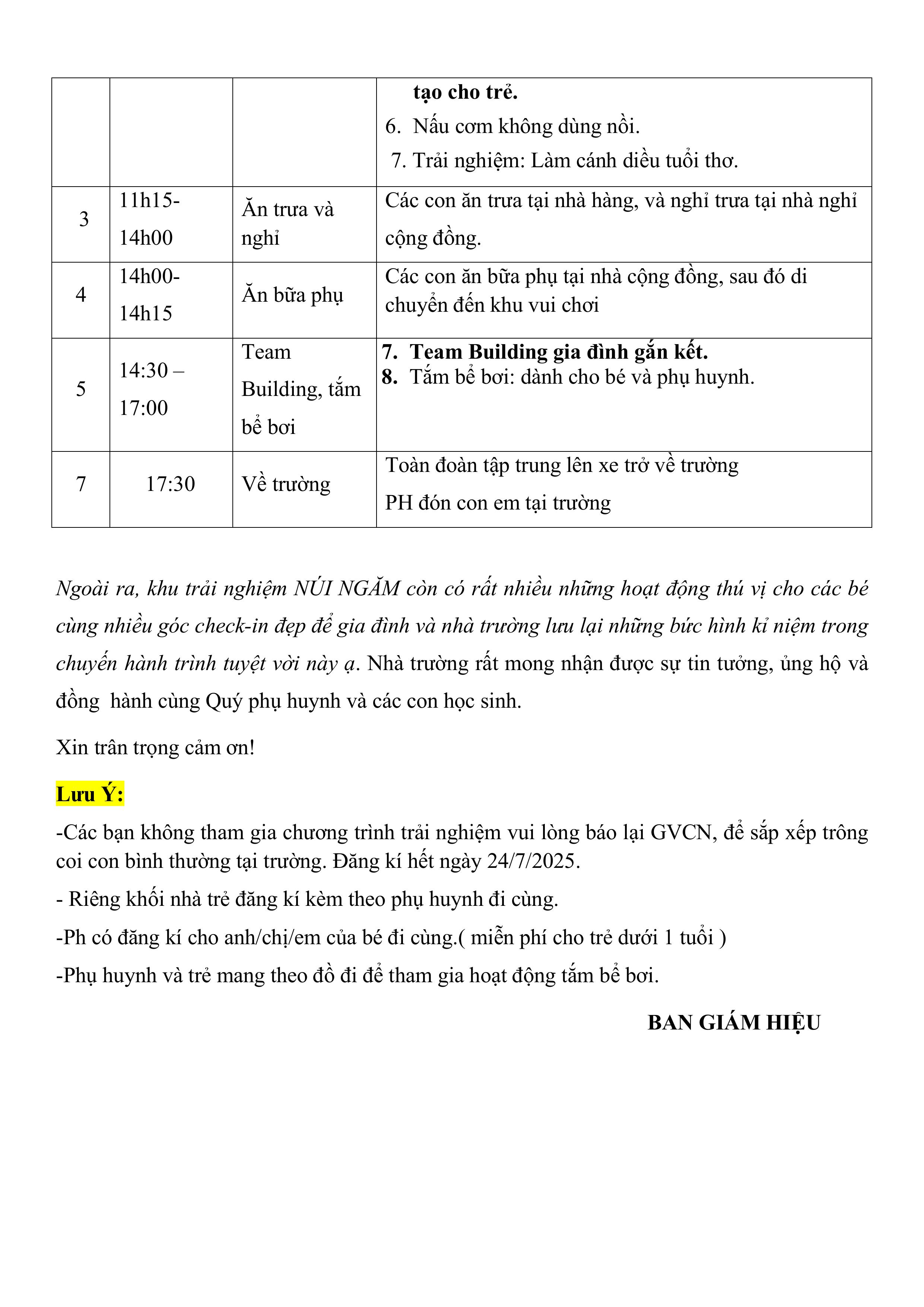 CHƯƠNG TRÌNH VUI CHƠI, TRẢI NGHIỆM “TRỞ VỀ TUỔI THƠ ” 19-7-2025 webmaster Phụ huynh bấm vào đây để lấy Thư Đăng Ký Thư Hồi Báo