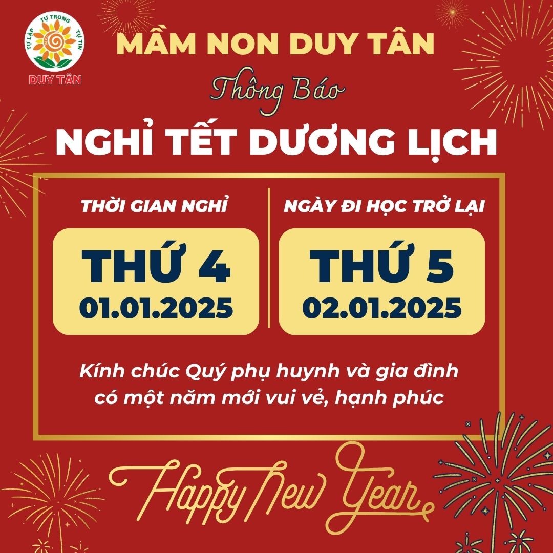 Mầm non Duy Tân xin thông báo tới Quý PHHS về Lịch nghỉ Tết dương lịch 2025 như sau: